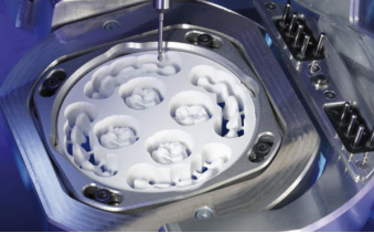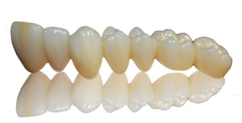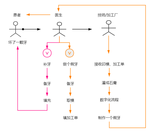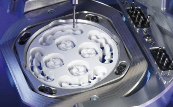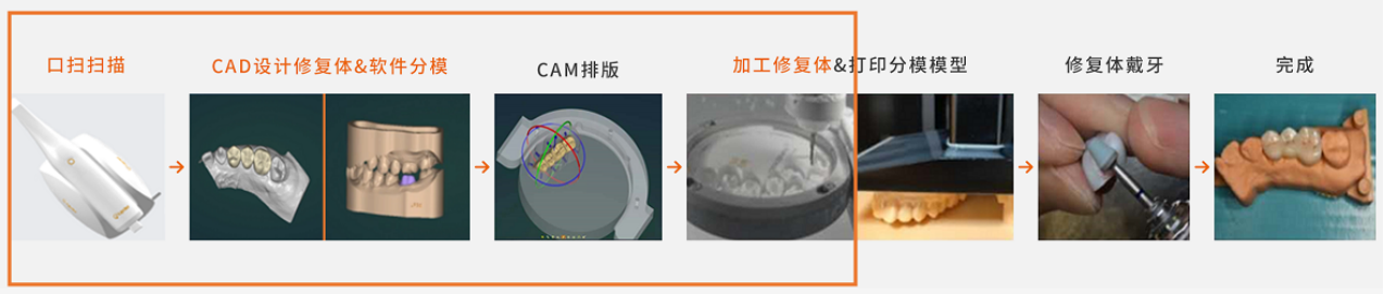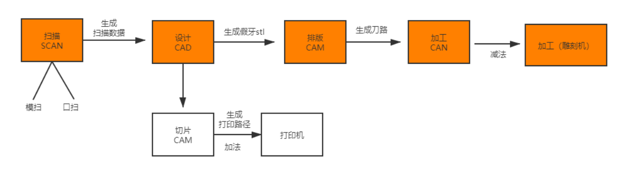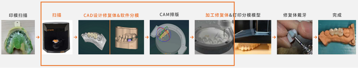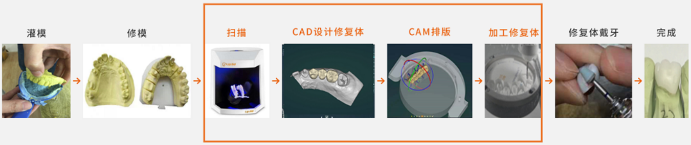 | 接收模型、设计单 | 灌模 | 修模 | 扫描 | CAD设计假牙 | CAM排版 | 假牙加工、烧结、戴牙 | 上釉、烧结、完成 | 消毒、质检、入库 |