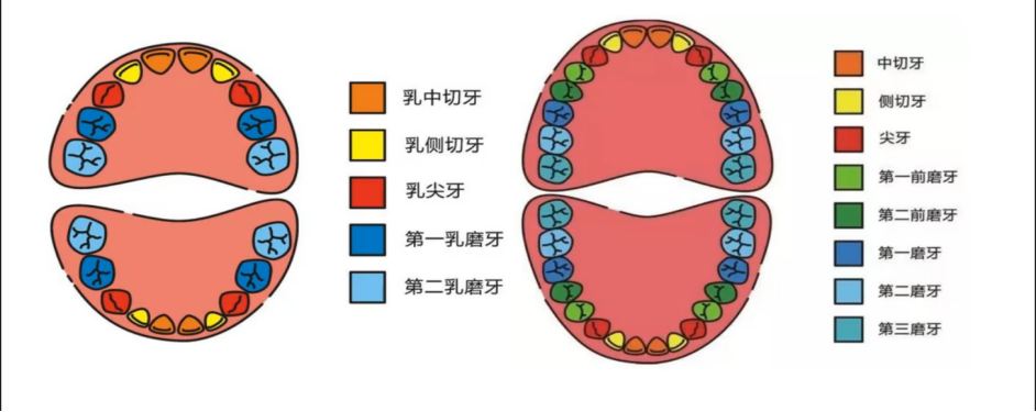 - 乳牙:20个。自婴儿出生后6个月左右,乳牙开始萌出,至2岁半左右萌出完成 。