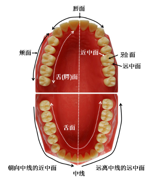 - 舌面:不区分前后牙,靠近舌头的一面。