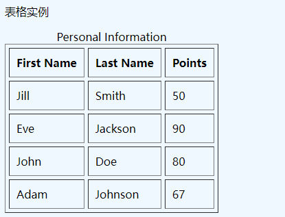| <table border="1" cellpadding="10" cellspacing="5"> <tr> <th>First Name</th> <th>Last Name</th> <th>Points</th> </tr> <tr> <td>Jill</td> <td>Smith</td> <td>50</td> </tr> <tr> <td>Eve</td> <td>Jackson</td> <td>90</td> </tr> <tr> <td>John</td> <td>Doe</td> <td>80</td> </tr> <tr> <td>Adam</td> <td>Johnson</td> <td>67</td> </tr> </table>