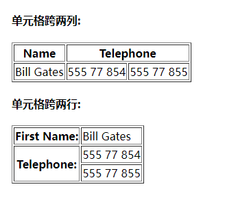 | <h4>单元格跨两列:</h4> <table border="1"> <tr> <th>Name</th> <th colspan="2">Telephone</th> </tr> <tr> <td>Bill Gates</td> <td>555 77 854</td> <td>555 77 855</td> </tr> </table>