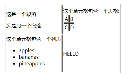 | <table border="1"> <tr> <td> <p>这是一个段落</p> <p>这是另一个段落</p> </td> <td>这个单元格包含一个表格: <table border="1"> <tr> <td>A</td> <td>B</td> </tr> <tr> <td>C</td> <td>D</td> </tr> </table> </td> </tr> <tr> <td>这个单元格包含一个列表 <ul> <li>apples</li> <li>bananas</li> <li>pineapples</li> </ul> </td> <td>HELLO</td> </tr> </table>