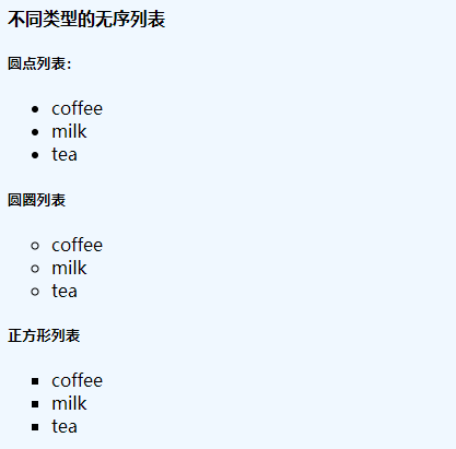 | <h4>不同类型的无序列表</h4> <h5>圆点列表:</h5> <ul style="list-style-type: disc"> <li>coffee</li> <li>milk</li> <li>tea</li> </ul> <h5>圆圈列表</h5> <ul style="list-style-type: circle"> <li>coffee</li> <li>milk</li> <li>tea</li> </ul> <h5>正方形列表</h5> <ul style="list-style-type: square"> <li>coffee</li> <li>milk</li> <li>tea</li> </ul>