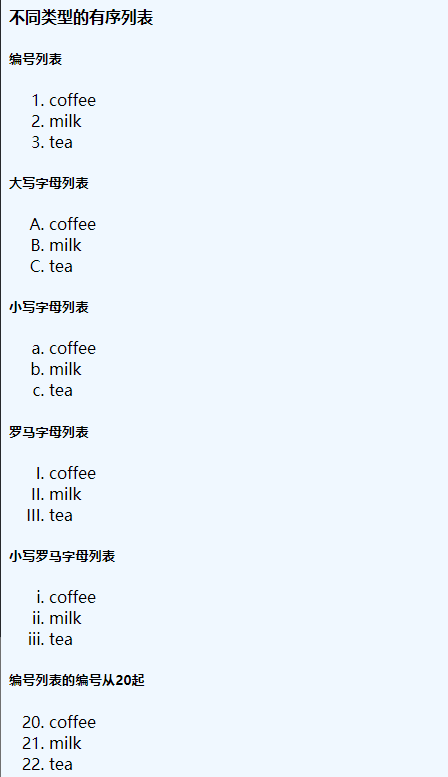 | <h4>不同类型的有序列表</h4> <h5>编号列表</h5> <ol type="1"> <li>coffee</li> <li>milk</li> <li>tea</li> </ol> <h5>大写字母列表</h5> <ol type="A"> <li>coffee</li> <li>milk</li> <li>tea</li> </ol> <h5>小写字母列表</h5> <ol type="a"> <li>coffee</li> <li>milk</li> <li>tea</li> </ol> <h5>罗马字母列表</h5> <ol type="I"> <li>coffee</li> <li>milk</li> <li>tea</li> </ol> <h5>小写罗马字母列表</h5> <ol type="i"> <li>coffee</li> <li>milk</li> <li>tea</li> </ol> <h5>编号列表的编号从20起</h5> <ol start="20"> <li>coffee</li> <li>milk</li> <li>tea</li> </ol>