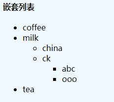 | <h4>嵌套列表</h4> <ul> <li>coffee</li> <li>milk <ul> <li>china</li> <li>ck <ul> <li>abc</li> <li>ooo</li> </ul> </li> </ul> </li> <li>tea</li> </ul>