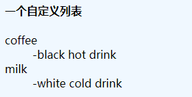 | <h4>一个自定义列表</h4> <dl> <dt>coffee</dt> <dd>-black hot drink</dd> <dt>milk</dt> <dd>-white cold drink</dd> </dl>