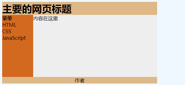 | <div id="container" style="width: 500px;" > <div id="header" style="background-color: burlywood;"> <h1 style="margin-bottom: 0;">主要的网页标题</h1></div>