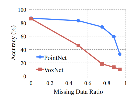 图8. PointNet v.s.VoxNet [17] 关于不完整的输入数据。指标是ModelNet40测试集的总体分类精度。请注意,VoxNet使用12个平均视点,而PointNet仅使用点云的一个视图。显然,PointNet对缺失点具有更强的鲁棒性。